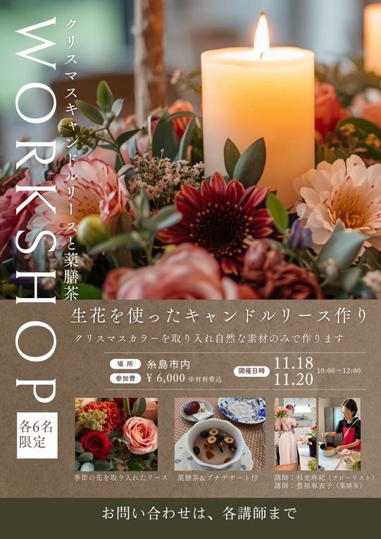 今回は、ちょっと早いクリスマス会♡ ということで、フレッシュなお花でキャンドルアレンジメントを制作していただき、そのあとはあたたかいサングリアと心も温まる薬膳茶でちょっと早いクリスマスパーティーをしましょう♪