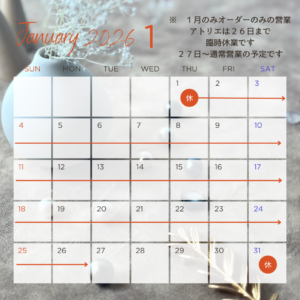 2026年の1月のみは、こちらの家庭の事情により、26日ごろまではオーダーのみの営業とさせていただき、店舗は臨時休業とさせていただきます。