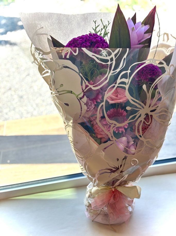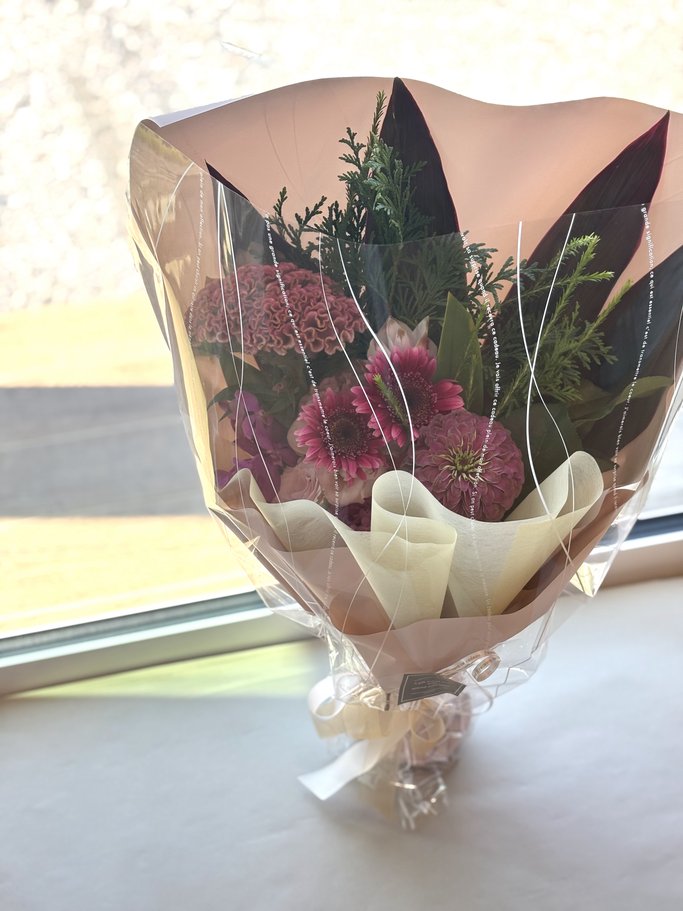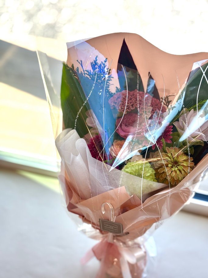 ※ 花束にはお水を含ませておりますが、お受け取りからなるべくお早めにラッピングを解いていただきますようお願いいたします。