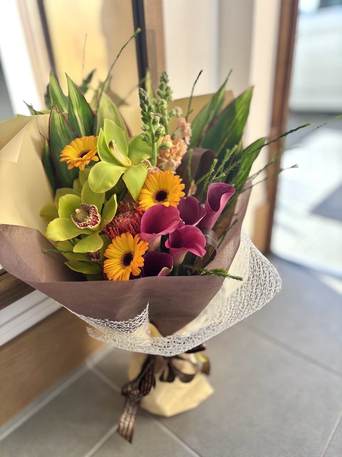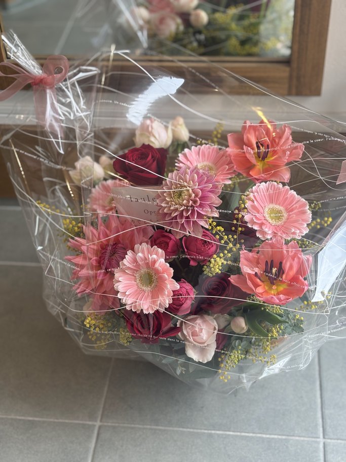 ※ 花束にはお水を含ませておりますが、お受け取りからなるべくお早めにラッピングを解いていただきますようお願いいたします。